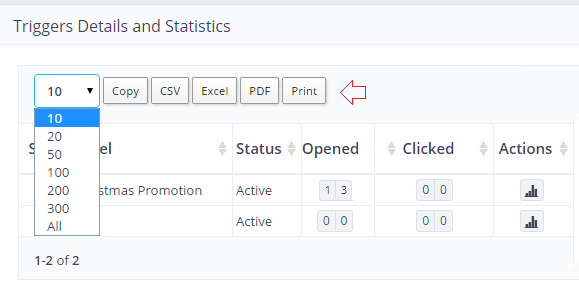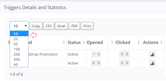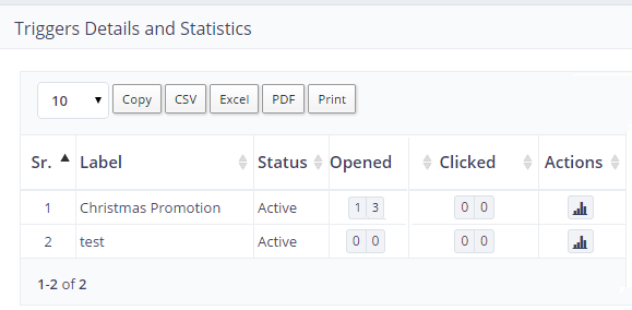 The table on the page consists of the information related to the results of the trigger based campaigns, which you have created to send automatically to your subscribers on momentous events. The criteria of triggers to perform the action can be set using more than one option within the application, view creating of the triggers for more information on how trigger based campaigns work? If you already have setup a few, reach “Trigger Stats” under “Statistics” from the left navigational menu to view, how the trigger based campaigns have performed?