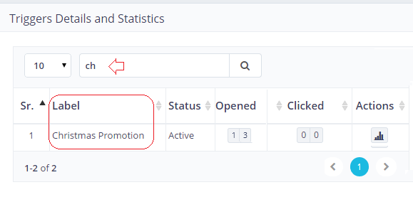 The search box helps to search a particular campaign from the list of sent. If you have sent a good number of trigger based campaigns, this helps you to search and view results of the particular trigger from the long list. Cut the process short, just type some unique identifiable information into the search box like schedule label or name to search the particular trigger stats.