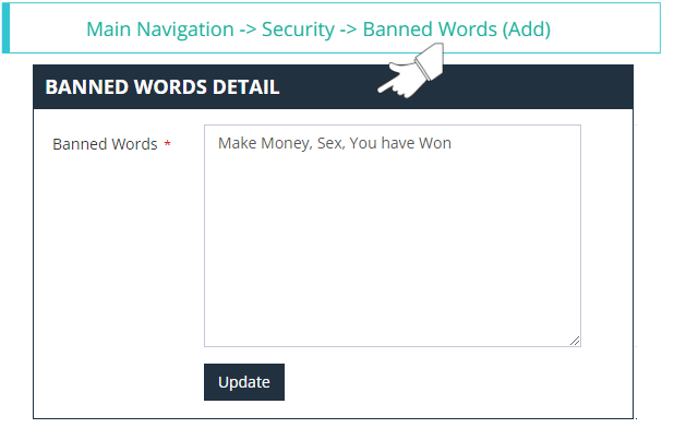 Enter comma-separated words and terms that you don’t want the client accounts to use in the content, e.g. Make Money, Sex, You have Won, etc. The words that you think can potentially be used in a spammy, unsolicited, and fraudulent message. Before the system supplies the client’s message to the gateway for sending, it checks the message content against all the banned words and stops it to relay through the gateway upon finding a banned word/term in the message content. As a result of trying a message with a banned word, an error message will be displayed suggesting the reason for not delivering the message. The client account will be able to see the band words highlighted to eliminate them from the message when trying again.