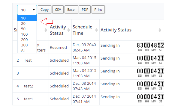 Sr | Serial number of scheduled campaigns in ascending order (1-10). You can view all the scheduled campaigns on one page, but if you have a large list of records to view, viewing them all at one page may reduce the loading speed. |