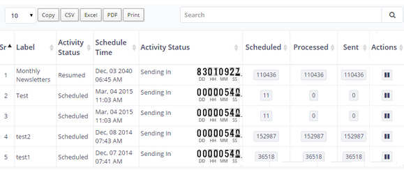 Activity Status | Whether the campaign is paused, resumed, finished or in progress. The column explains the activity status of the scheduled campaigns in the queue. |