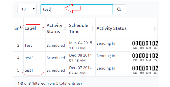 Search the details of particular campaign from the list of scheduled email campaigns. You can search by typing the schedule label of particular campaign, as. The search query sorts and processes the records efficiently on the same page.