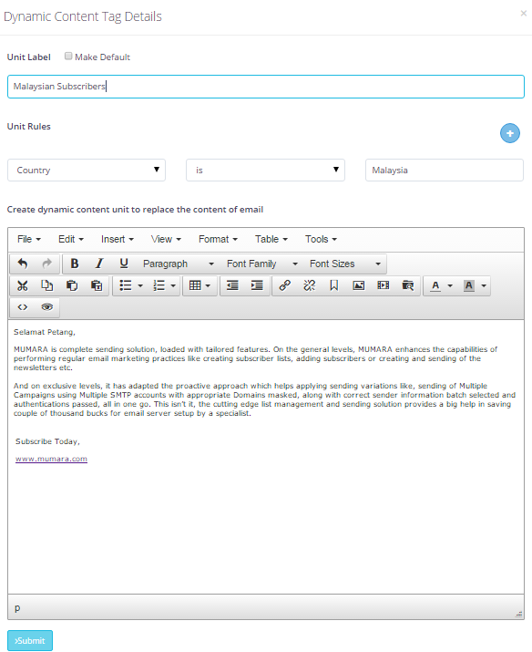 For our example case, we’ll create a content unit to replace the greeting text for all the subscribers whose country is saved as Malaysia, in the country field. “Malaysian Greetings” can be the name of this content unit, from the first dropdown of Unit Rule”, “Country” field is selected to apply this rule on.