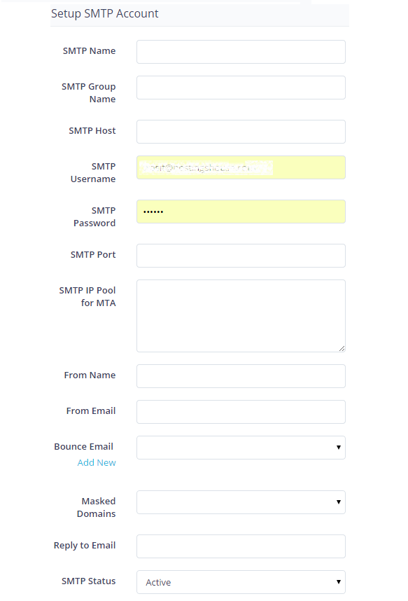 SMTP Username | The username of the SMTP you want to add into this account. Make sure that you have provided a valid and correct username. The field isn’t mandatory as in some of the cases SMTP isn’t protected by a username or password. You just need to provide an SMTP host, group, and port to work this account properly. However, having an SMTP without a username and password protection makes it vulnerable to misuse. Therefore It is recommended to protect the SMTP with a username and password. |
