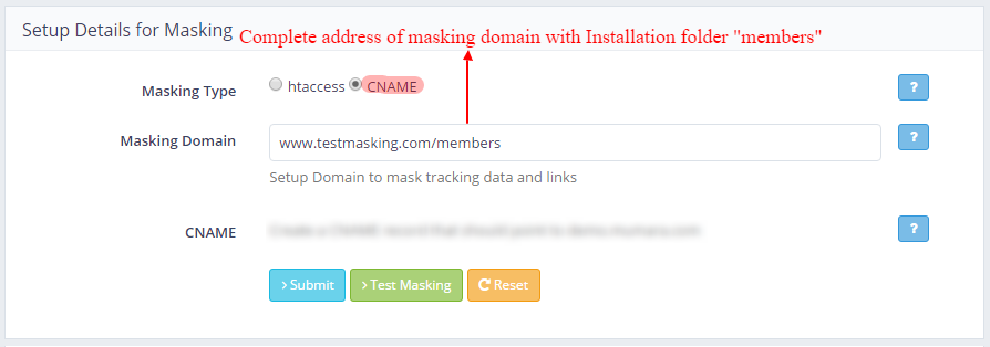 You will have the field to enter the URL of the domain that you want to point to. In our example case, the URL field will be filled with testprimary.com. If the installation of the application (Responsible for Tracking) has been done using a separate directory like www.testprimary.com/members, don’t mention the directory name (After /) in the URL field, just provide a qualified domain name and move ahead. However as mentioned above, you need to provide the directory path in the field of “Masking Domain” (www.testmasking.com/memeber).