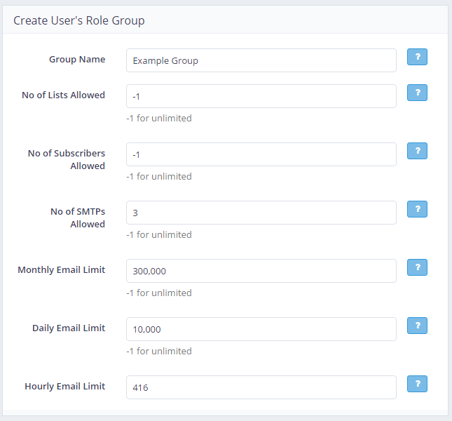 Provide the maximum number of subscribers you want the users in this group to add to the lists. If you want them to add unlimited subscribers, -1 is the value for unlimited subscribers to provide in this field.