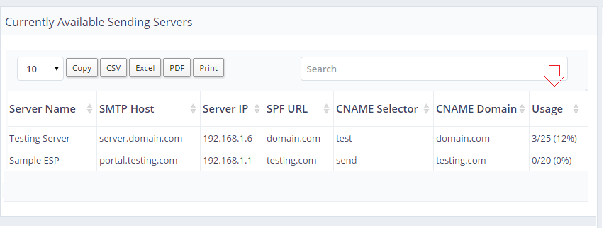 The following figure shows two sending servers, the first one is 12% used and the second one is not used at all, with 0% usage. Upon selecting the sending preference as “Add to Least Full Server”, the application will add new clients into the server with 0% usage, as being the least full server between the two, 1) Testing Server and 2) Sample ESP.